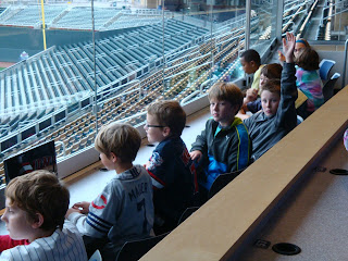 We also had a science lesson in the visitor's batting cage. We learned about the composition of a baseball, how bats are made, what the "sweet spot" is on a bat, and about reaction time. We also learned what happens to a ball and bat when a player gets a hit.